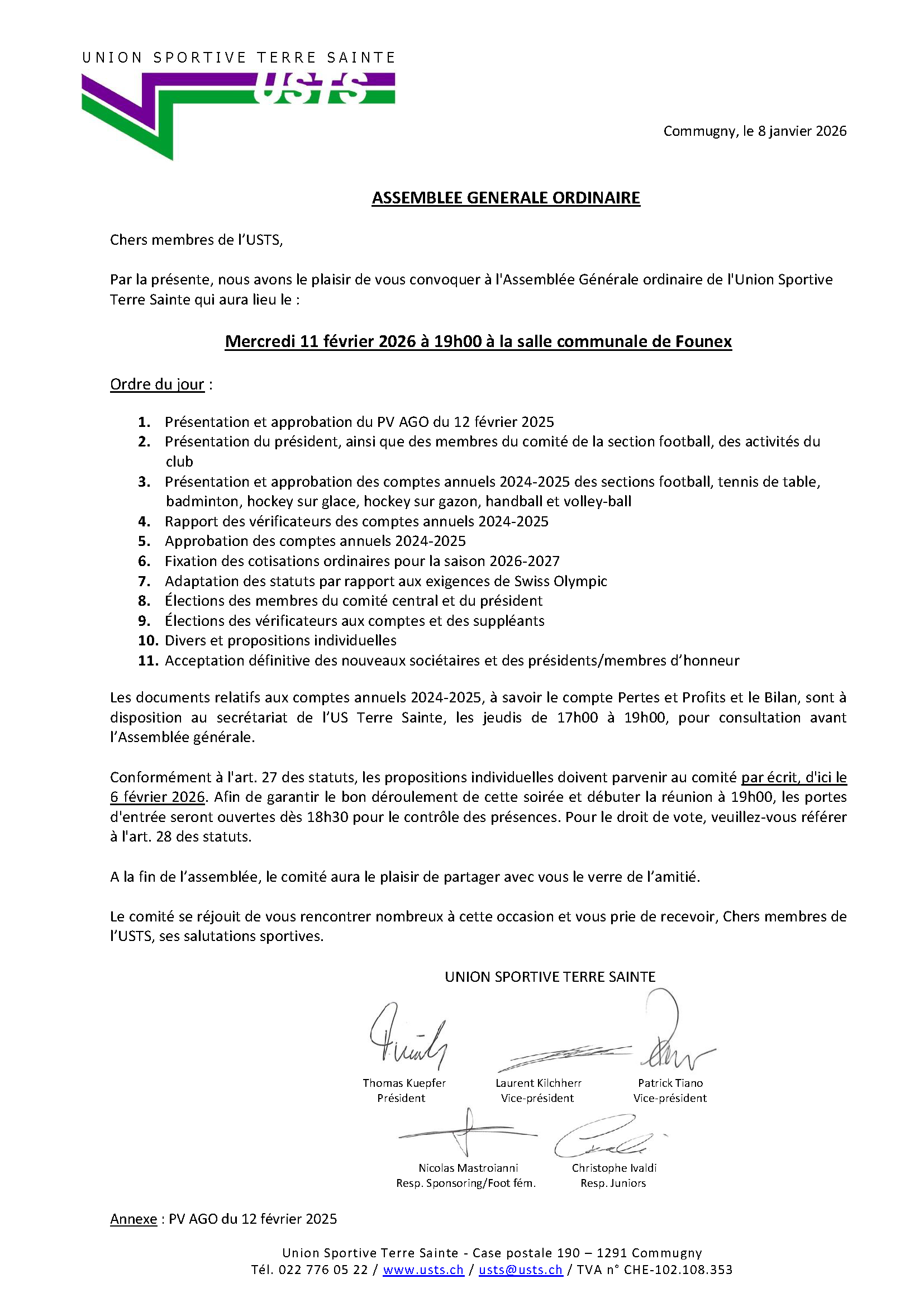 - Avec 28 équipes et plus de 600 membres, l’US Terre Sainte continue de grandir et d’affirmer ses ambitions sur les terrains cantonaux et interrégionaux, en restant fidèle à ses valeurs : formation, respect et esprit d’équipe.